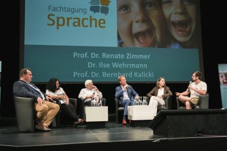 Diskussionsrunde nach der Fish-Bowl-Methode: Prof. Dr. Bernhard Kalicki, Prof. Dr. Renate Zimmer, Dr. Ilse Wehrmann, Moderator Markus Brock und zwei Teilnehmer/innen aus dem Publikum (v.l.n.r.)